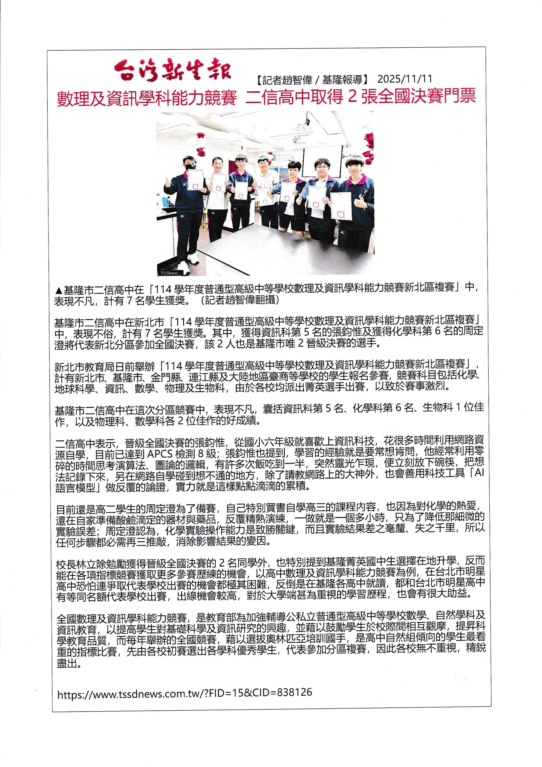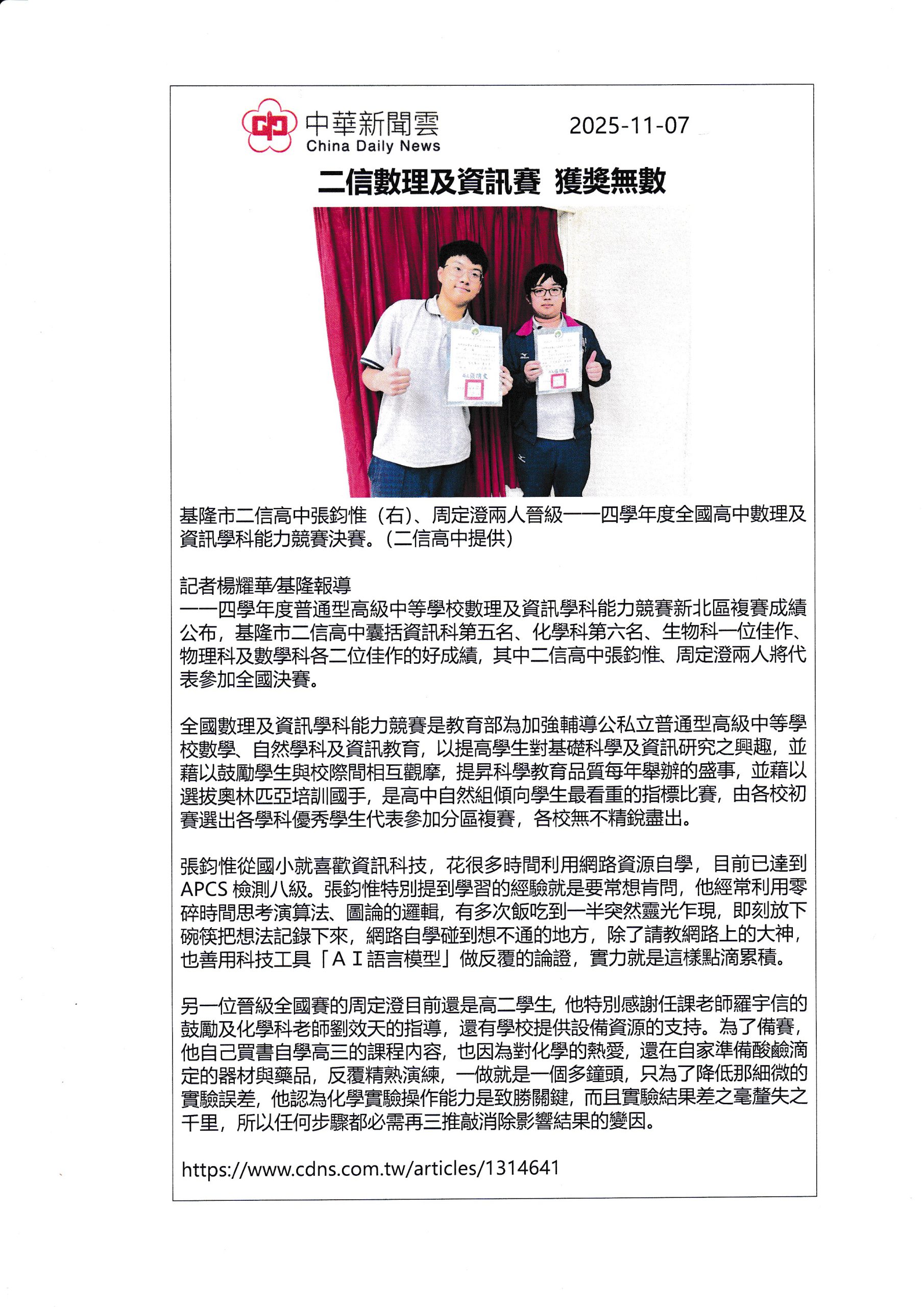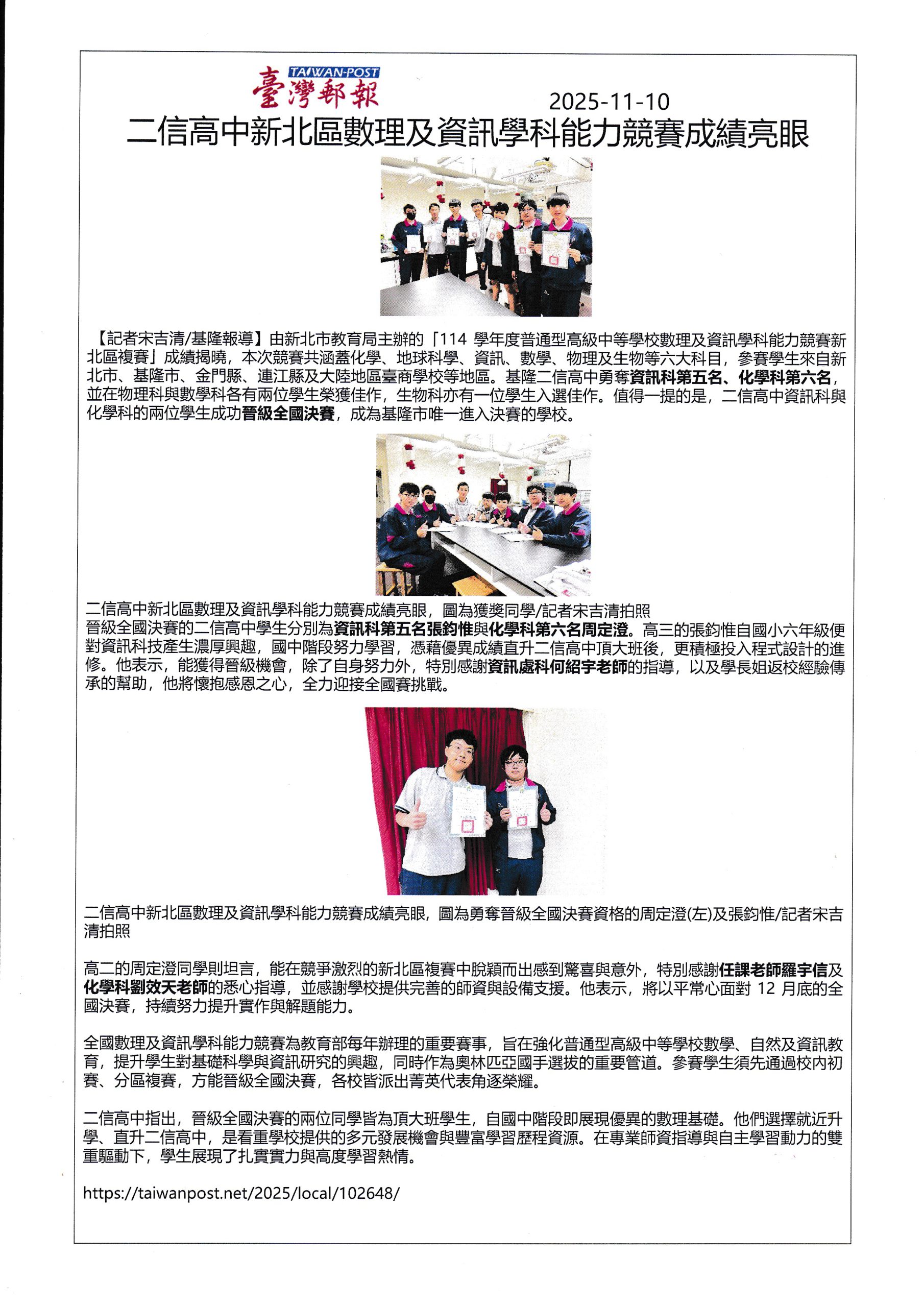 由新北市教育局主辦的「114學年度普通型高級中等學校數理及資訊學科能力競賽新北區複賽」成績公布,總計6項科目包括化學、地球科學、資訊、數學、物理及生物科,參賽的學生來自新北市、基隆市、金門縣、連江縣及大陸地區臺商等學校,基隆市二信高中囊括資訊科第五名、化學科第六名、生物科1位佳作、物理科及數學科各2位佳作的好成績,另外安樂高中物理科及數學科各1位佳作,基隆高中及暖暖高中則在數學科各獲得1位佳作,其中二信高中資訊科第五名及化學科第六名將代表新北分區參加全國決賽,也是基隆市唯二晉級決賽的選手。