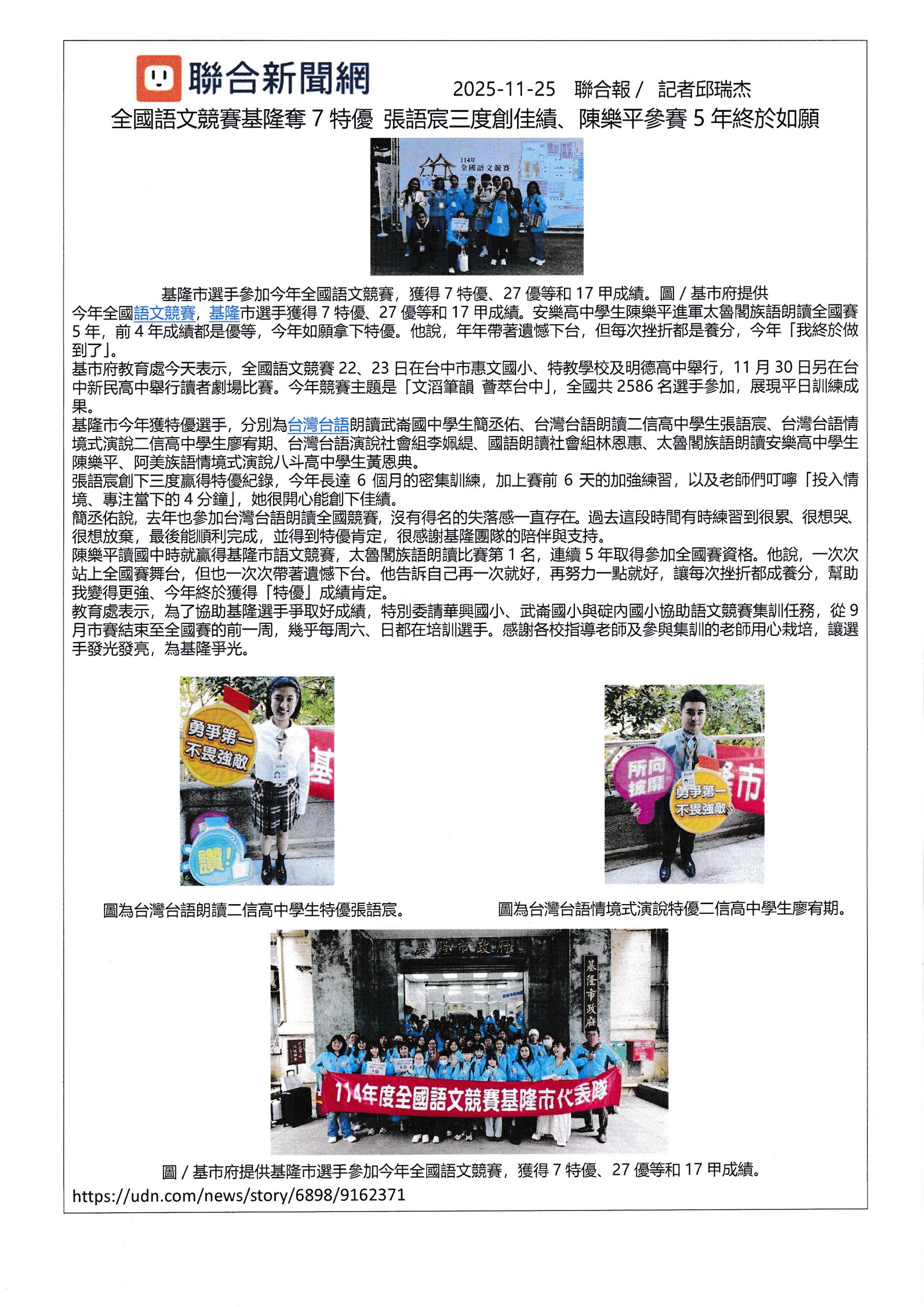 全國語文競賽基隆奪7特優,二信高中占2名,張語宸創三連霸